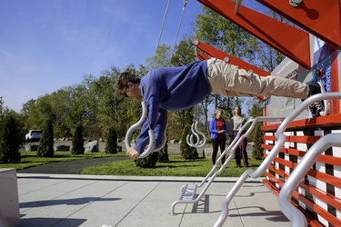 Brandan Redick, a Berne-Knox-Westerlo cheerleader, goes horizontal at the new Fitness Court in Berne's town park on Sept. 30, moments after the ribbon was cut. Albany County Executive Daniel McCoy said the county’s Innovation Partnership with MVP paid $195,500 for the court while the county paid an additional $50,000 in labor, equipment, and materials to construct the court.