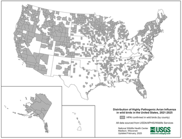 The National Wildlife Health Center has mapped the counties, including Albany County, across the United States where confirmed cases of Highly Pathogenic Avian Influenza, known as HPAI, have occurred from 2021 to 2025.