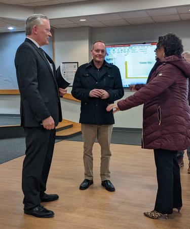 Amanda Beedle, right, reaches out to Supervisor Peter Barber on Tuesday after he delivered his annual State of the Town address. Beedle is the town’s deputy supervisor, replacing Christine Napierski who was elected town justice. At center is Councilman Kevin McDonald.