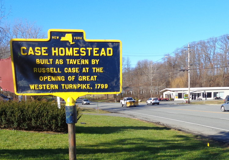 Shown here is the most recent reposting of the marker for the former Case Homestead, which was resurrected from the dead by Tyler Rapp of the Guilderland Highway Department. Mr. Rapp welded the pieces back together after it was struck by a car. Haluska will credit the Guilderland Water Department and the National Grid for cooperating in the reinstallation of this sign.