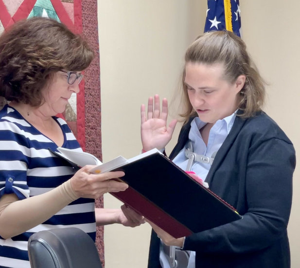 For decades, Voorheesville Clerk-Treasurer Linda Pasquali administered the oath of office for village trustees, as she is shown here, administering the oath to Trustee Kaitlin Wilson. Recently, Pasquali took the oath of office herself after she was named as Sarita Winchell’s replacement on the village board of trustees.