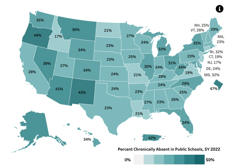 The Department of Education maps chronic absenteeism across the country, putting New York state at 35 percent. Oregon is mapped at the highest rate, at 44 percent, followed by New Mexico at 43 percent and Arizona at 42 percent.