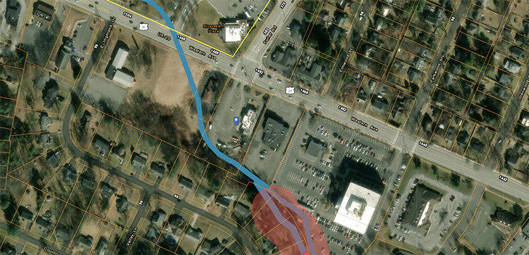The Krum Kill, illustrated in blue, runs through and under the rear of the Burger King property at 1480 Western Ave.; the red area depicts a FEMA-designated flood zone.