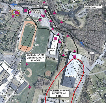 The land, about 1,000 feet long and 400 feet wide at its widest point, runs in an undulating line from the northwest tip of Area of Concern 3, which is a former burn-pit area at a former Army depot in Guilderland Center. Most of the decommissioned depot land is now owned by Northeastern Industrial Park. The problematic land runs across the top of the school district’s new bus depot, and through Guilderland’s parking lot to the north of the football field. It is just south of the Black Creek, which feeds the Watervliet Reservoir, where Guilderland residents get most of their water.