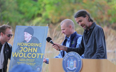 Over 100 people attended a ceremony to honor John Wolcott, a founder of Save the Pine Bush who led hikes in the globally rare pine barrens for 40 years.