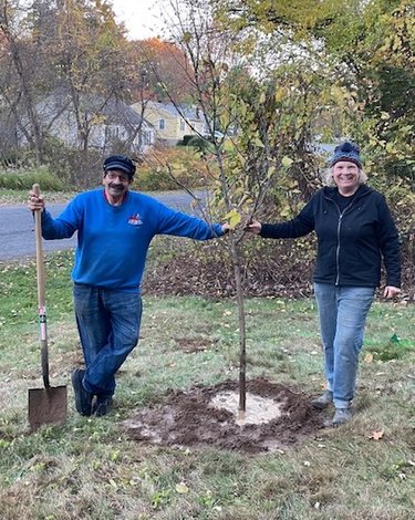 I thought I would send you a seasonal and feel-good photo. This is a picture of Stephen Trimboli (known as “The Grillmaster” from Guilderland schools and the husband of Deb Trees) and me planting a tree at his home on Monday afternoon.