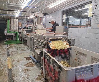 The old press, which required two operators and frequent resets, could process about 840 pounds of apples per hour. The new continuous belt press processes more than 2,600 pounds per hour, greatly increasing production while reducing labor and cleaning time.