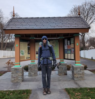 Avraham Bernstein, from Brooklyn, started in Manhattan on Nov. 2 to through-hike the 358-mile Long Path end-to-end, finishing at our new kiosk in Altamont on Monday, Dec. 1. He made perfect timing to complete his close to a month-long trek just before an 8-inch snowstorm hit the next day.