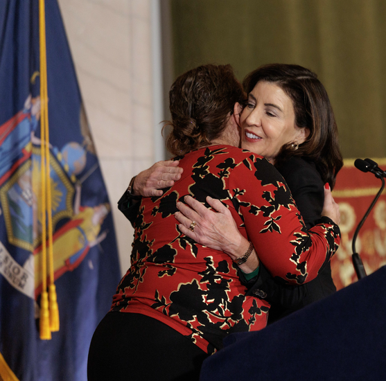 Cari Scribner hugs Governor Kathy Hochul as she signs legislation regulating kratom.