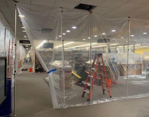 Whole sections where patrons used to sit, browse, or congregate are encased in protective plastic, augmenting the plexiglass panels that stand ready for welcoming patrons back safely to the main areas of the library before the end of the year. The scene is somewhat reminiscent of a transparent Halloween fun-house maze, while still allowing for daily staff duties.
