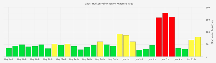 A month-long look back at air quality in the Upper Hudson Valley, which includes Albany County, is charted by the Environmental Protection Agency. The three tall red bars for June 6 to 8, show “unhealthy” air while the shorter yellow bars show “moderate” air quality and the shortest green bars show “good” air-quality conditions.