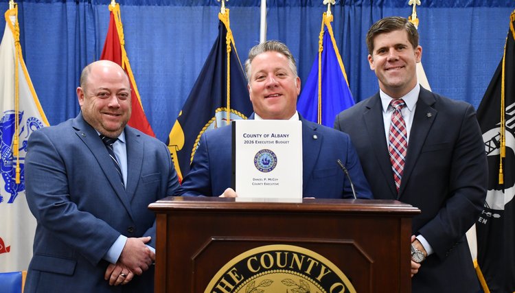 Albany County Executive Daniel McCoy, at center, presented his 12th executive budget on Wednesday. He is pictured with Budget Commissioner Dave Reilly, at left, and Deputy County Executive Mike McLaughlin