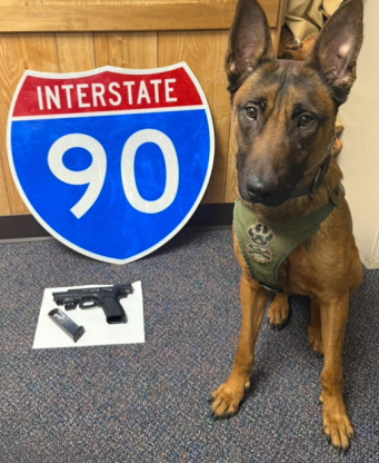 Ash, a trained State Police dog, helped troopers find an illegally possessed loaded handgun and an illegally possessed high-capacity magazine after a traffic stop on I-90 in Guilderland.