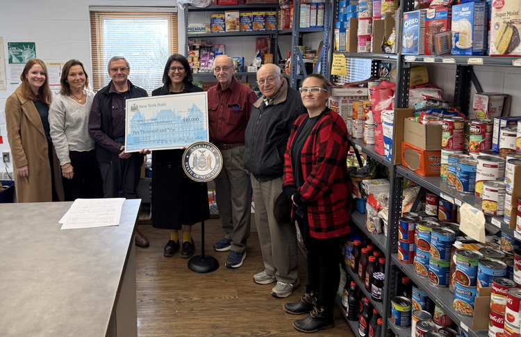Assemblywoman Gabriella Romero presents New Scotland Community Food Pantry volunteers Ivan Gotham, to Romero’s left, and Dennis Ulion, to her right, with a check for $10,000.