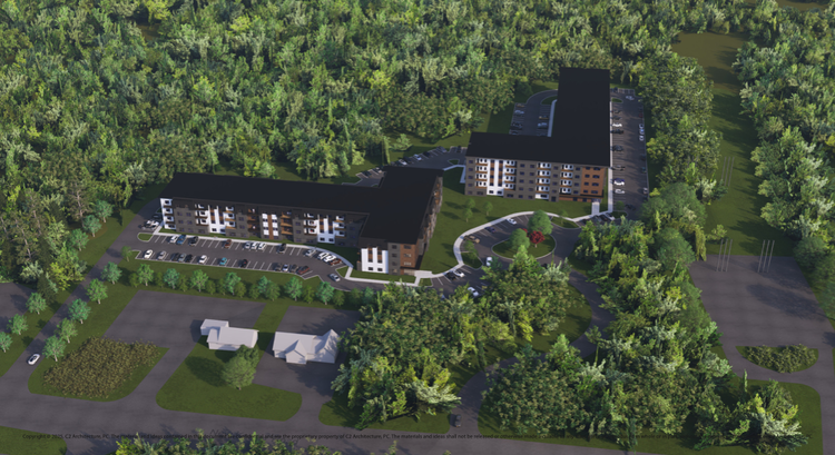 A rendering of the two buildings that would have a combined 210 apartments, accessed from New Karner Road (Route 155). Two single-family homes already exist next to the road.