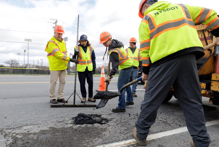 Kathy Hochul, at a press event on April 6, watches a DOT crew fill a pothole before filling one herself.