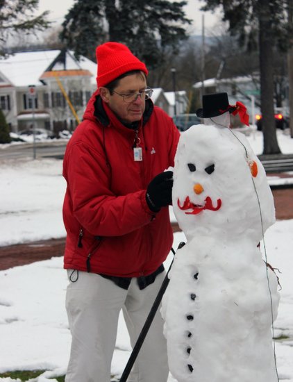 Never too old to play in the snow: Michael Jarus works on patching up a two-sided snowman that had begun to melt in the warm weather following last Wednesday’s snowstorm.