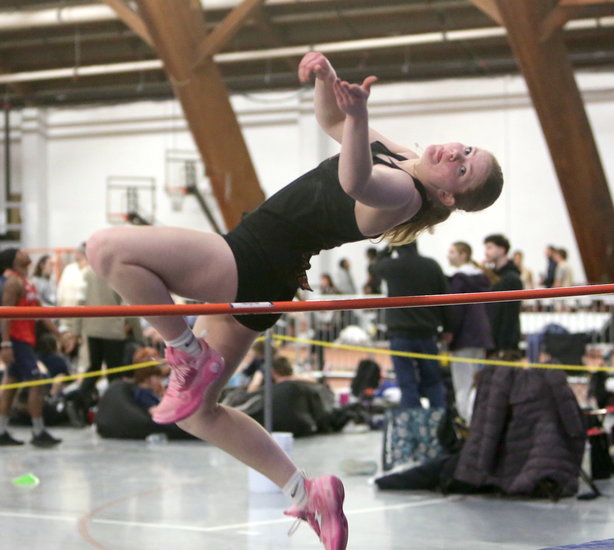 Flying confident: Bulldogs’ Kallie Bates leaps up as she looks at the bar as her body soars over the bar. Bates finished second in the high jump with a height of 4 feet, 3 inches.