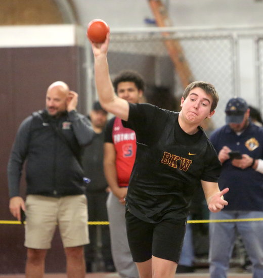 Making a pitch: Bulldogs’ Jameson Poole brings his arm forward on his first throw as he prepares to release his shot. Poole finished 11th with a distance of 30 feet, 9.50 inches.