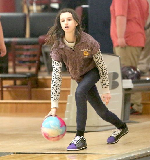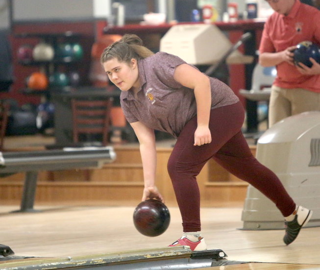 Determined: Bulldogs’ Avery Rowe releases her ball after sliding to a stop at the foul line in the first game. Rowe shot a 390 triple with a 148 high game.