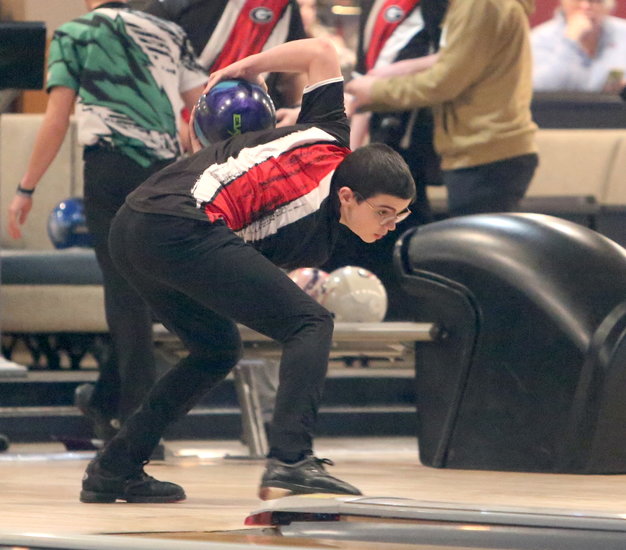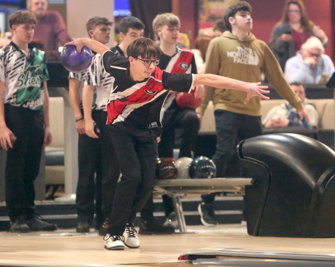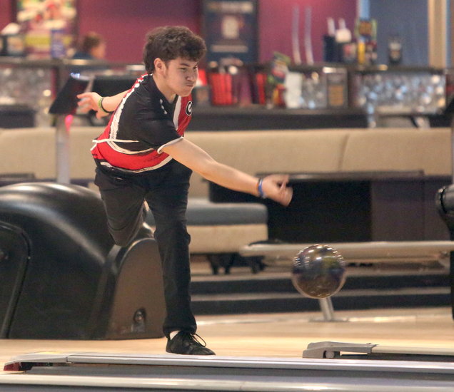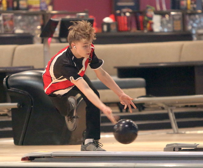 Dominant throw: Guilderland’s E.J. Taber stops on his left foot as he releases his ball onto the lanes as it heads towards the pins. Taber shot a 745 triple with a 279 high game.