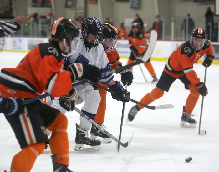 Swarmed: Three Eagles players all converge to the loose puck in an attempt to beat the lone Rivermen player after a faceoff.