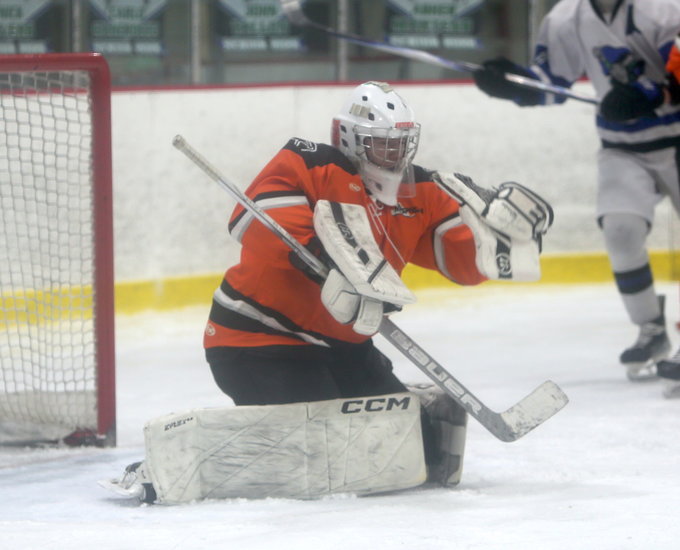 Perfect catch: Eagles’ Eamon Fitzpatrick holds his glove up to snag the shot that was shot towards him in the second period. Fitzpatrick made 38 saves.