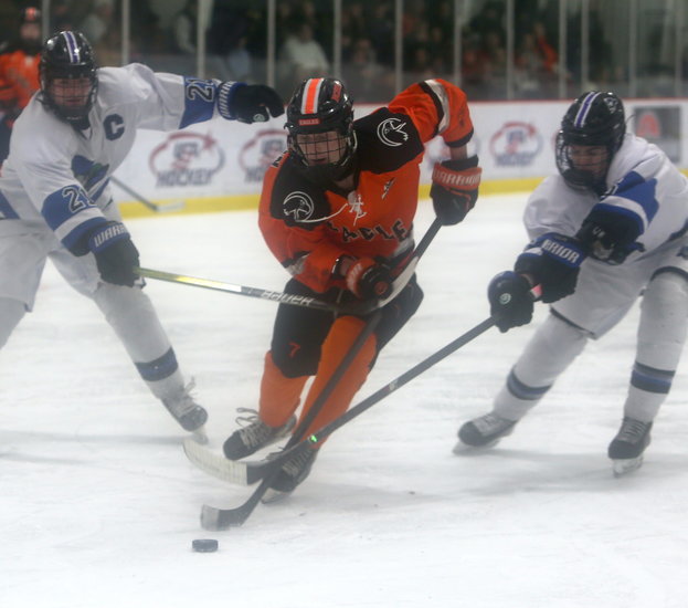 Quick split: Eagles’ Eamon McClain gets past Rivermen’s Parker Mija (21) and Troy Sims (6) as he heads towards goal.