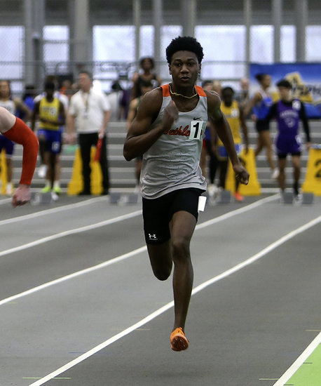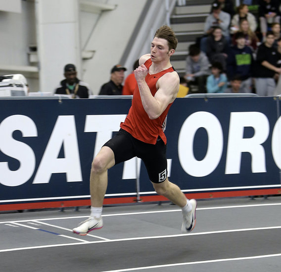 Hard sprint: Bulldogs’ Kole Irwin comes down the track at full speed as he battles seven other runners in the 55-meter dash final. Irwin finished fifth in the state and federation with a time of 6.41 seconds.