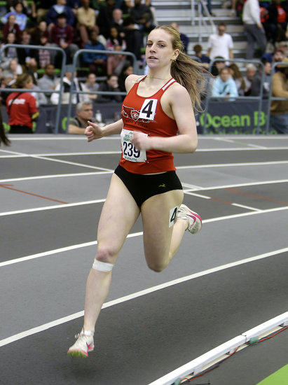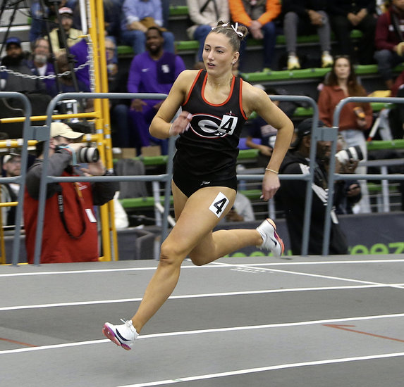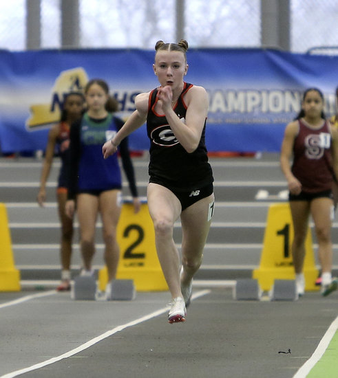 Going hard: Guilderland’s Fiona McCarthy swings her arms quickly as she comes down the track in the 55-meter dash semifinal. McCarthy finished 28th in the state with a time of 7.46 seconds.