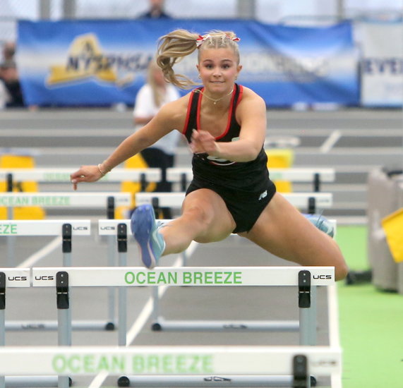 Strong finish: Guilderland’s Parker Steele uses her late kick in the 55-meter hurdle finals as she approaches the finish line. Steele finished fourth in the state and federation with a time of 8.17 seconds.