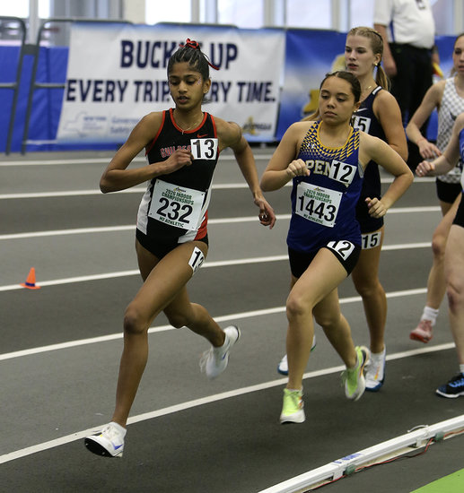 In the mix: Guilderland’s Tara Iyer leads the second group of runners in the first heat of the 3200-meters. Iyer finished 25th with a time of 10:21.99.