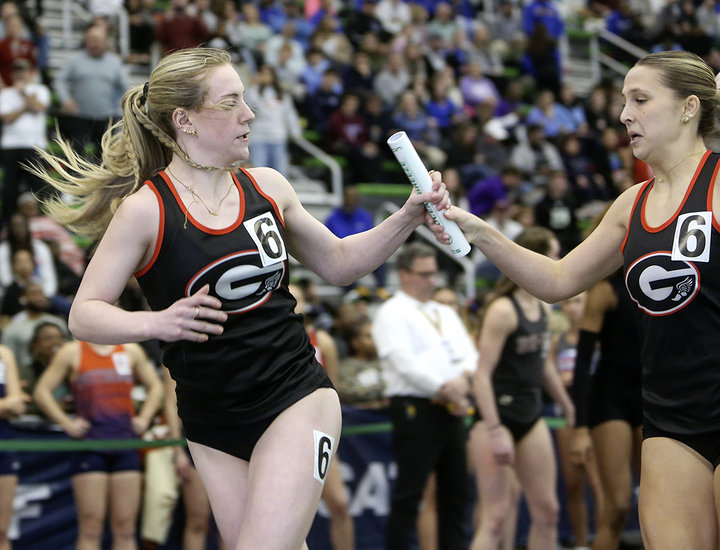 Championship handoff: Guilderland’s Lauren Hickey extends the baton to teammate Addison Vellekoop for the last leg of the 4x400-meters relay where Vellekoop won it coming off the last turn for the Dutch. Guilderland won the state title with a time of 3:54.00, which broke the school record. Then, on Saturday, the team finished 8th in the federation.