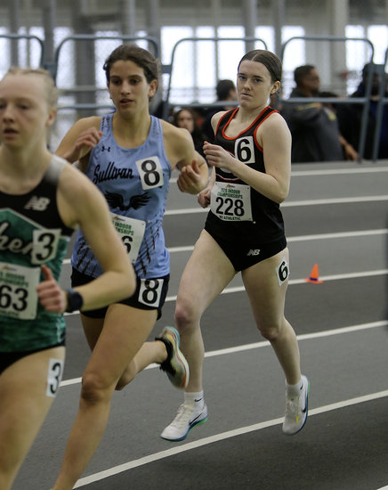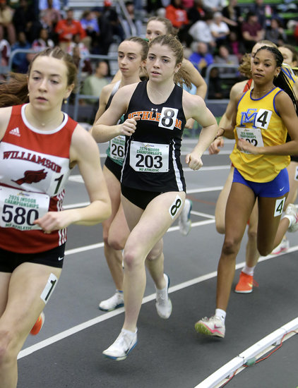 Trying to find an opening: Guilderland’s Braelyn Cornell comes off the turn during her second lap in the 1000-meters. Cornell finished 13th in the state with a time of 3:00.14.