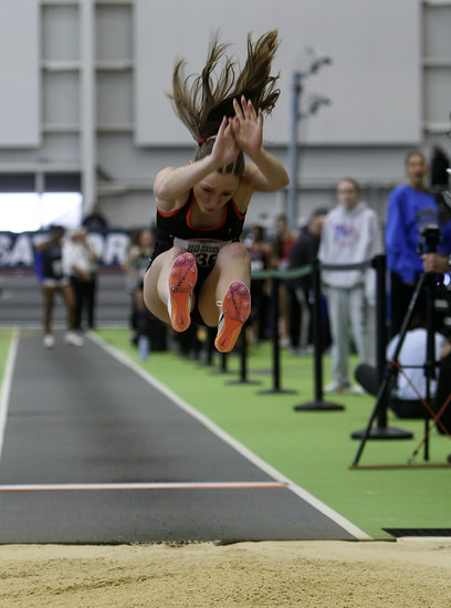Big fly: Guilderland’s Arianna Mills pushes off the board hard as she flies towards the pit in the long jump event. Mills finished 16th in the state with a distance of 16 feet, 10 inches.