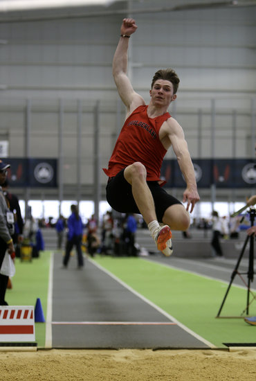 Full extension: Guilderland’s Jack Larson flies off the board as he soars towards the pit on his first attempt in the long jump. Larson finished 6th in the state and federation with a distance of 23 feet, 1.50 inches.