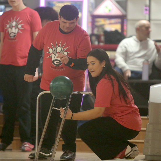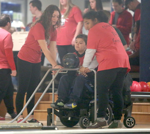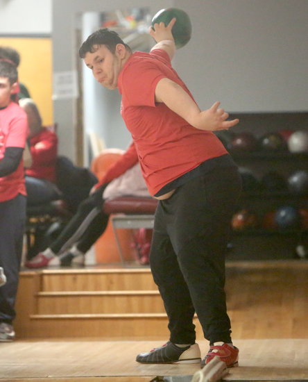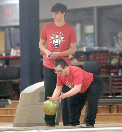 Perfect hit: Guilderland’s Anthony Petrucci watches the ball go down the ramp as teammate Teanne Zacharewicz directs it down the lane.