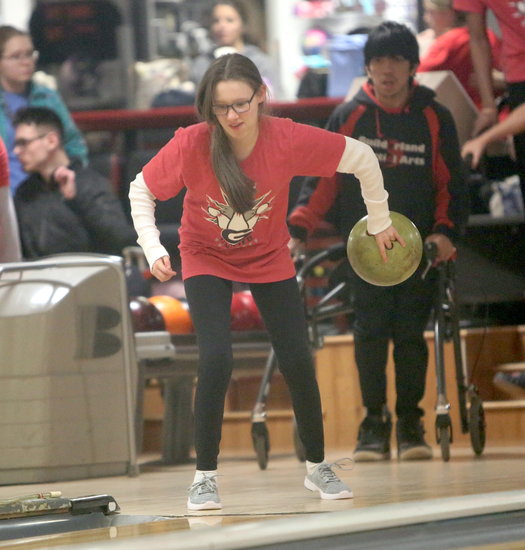 Flick of her wrist: Guilderland’s Evelyn Willetts stops at the foul line as she looks to release the ball with her left hand.