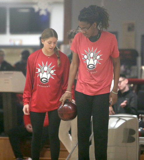 Working together: Guilderland’s Juliette Vennard and Gigi Santaniello talk with Sam Moffre on where he wants to stand before releasing his ball.