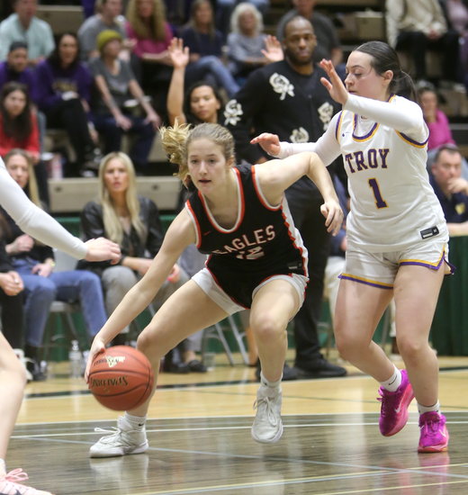 Taking it down low: Eagles’ Macy Young dribbles towards the baseline as she looks to get past Troy’s Addie Haskin in the second half. Young had eight points, four rebounds, and one assist.