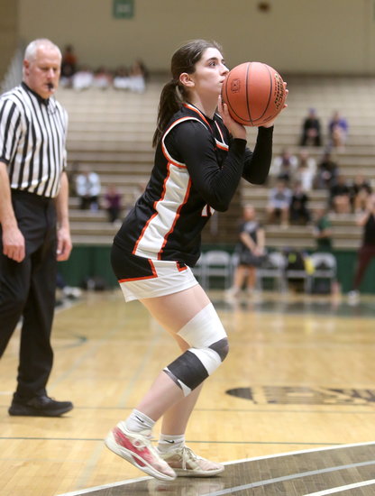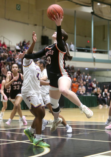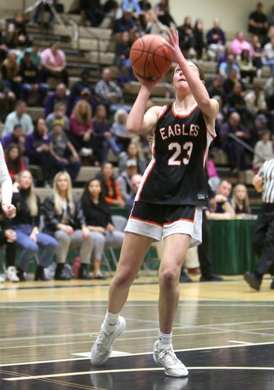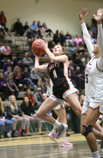 Quick open look: Eagles’ Brynn Elfeldt takes the pass from a teammate and looks to get off a layup before the defense comes over. Elfeldt had 11 points and two rebounds.