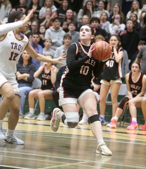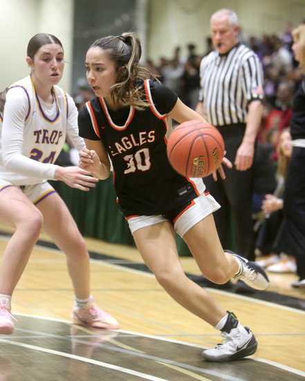 Coming up big: Eagles’ Ella McCarthy looks to shake off Troy’s Lilliana Smith’s defense with under one second left as she prepares to make the game-winning shot with just 0.01 seconds left. She succeeded — the Eagles won Section 2, Class AA sectional title on Monday night. McCarthy had six points, three rebounds, and three assists.