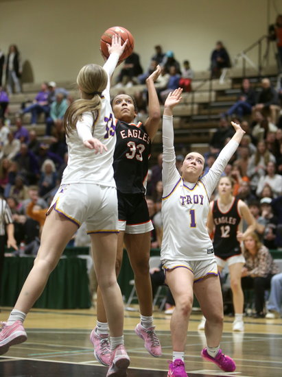 Big shots: Eagles’ Makaya McCann takes a fadeaway shot as Troy’s Samajia Arrington tries to get her hand on McCann’s shot in the fourth quarter. McCann led the Eagles’ with 14 points, two assists, and six rebounds.