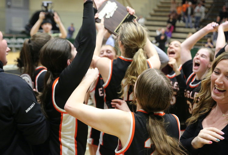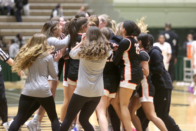 Jubilation: All members of the Bethlehem girls basketball team stormed the court after the final buzzer to come together with happiness after winning the Sectional title.