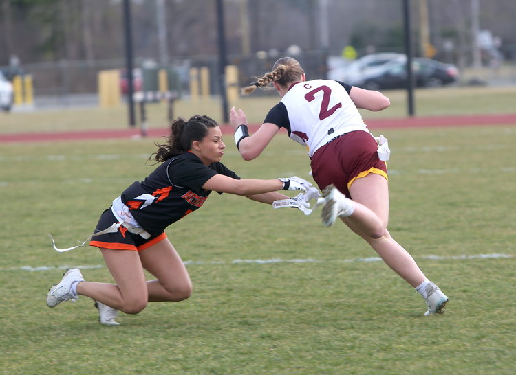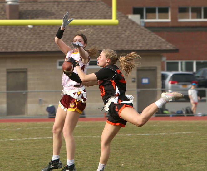 Big reach: Eagles’ Maddie Lee lunges towards the Colonie players flag as she attempts to run towards the end zone.