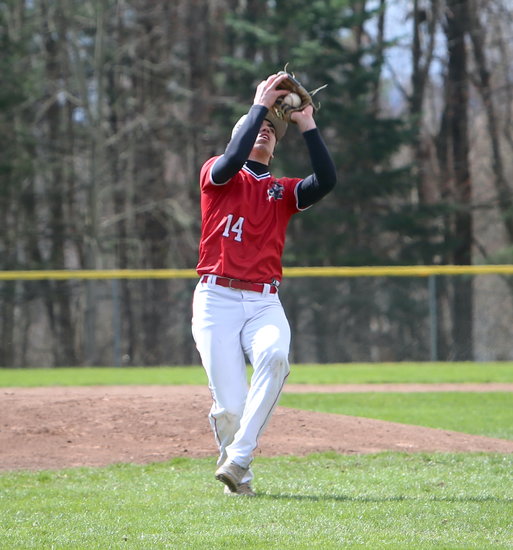 Big squeeze: Guilderland’s Landon Warchol makes sure he catches the easy pop-up in the first inning as he puts his hand on his glove to secure it.
