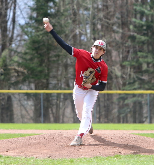 Holding it down: Guilderland’s Andrei Flynn pushes off the rubber to deliver the pitch towards the plate in the fourth inning. Flynn went three innings giving up only one hit while striking out three and walking two.
