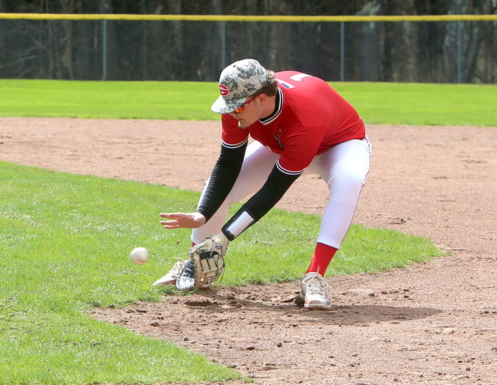 Easy scoop: Guilderland’s Travis Berschwinger bends down with his glove wide open to field the ball as it bounces towards him.