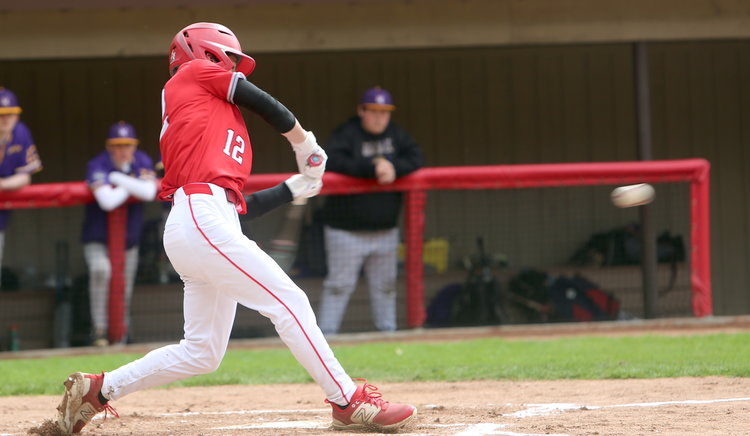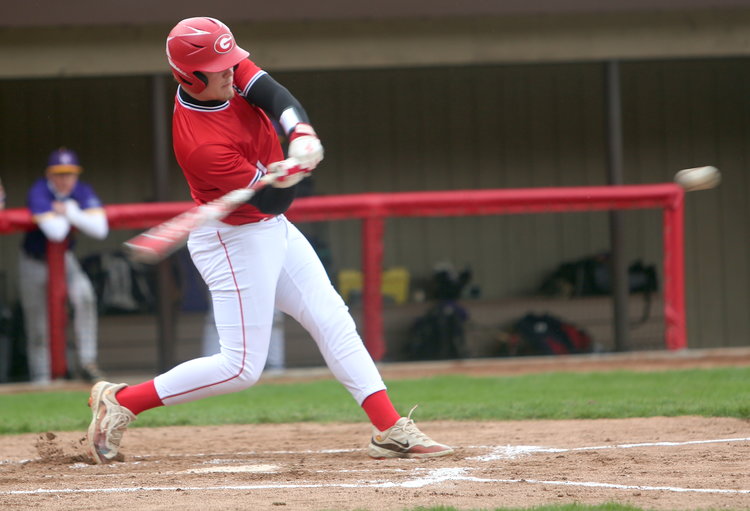 Adding to the hit parade: Guilderland’s Travis Berschwinger swings his bat towards the incoming pitch. Berschwinger had one hit in three at-bats while scoring once and two RBIs.