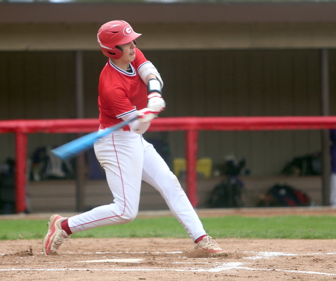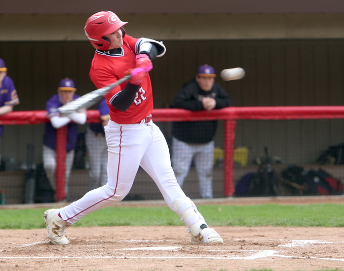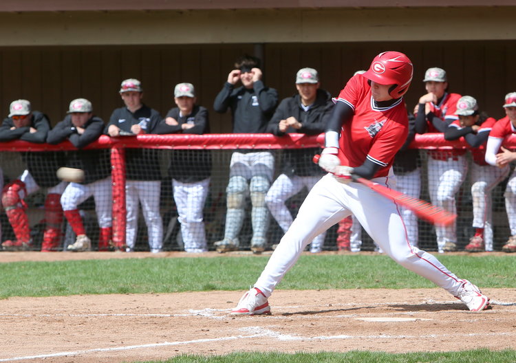 Driving it: Guilderland’s Jake Pensabene swings his bat towards the high pitch looking to drive it towards the outfield. Pensabene had a hit in two at-bats while scoring once and two RBIs.